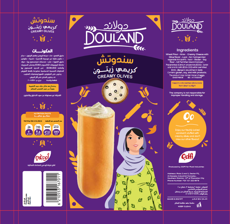 • Wheat Flour – Water – Creamy Cheese with Olive flavor – sugar – Non hydrogenated vegetable fats (palm) – Yeast – Gluten – Soy flour – Salt Permitted bread improvers – Preservatives (Calcium propionate (E282) – Sorbic acid and its salts (E200-202) within permitted limits. Allergens are printed in bold. Contains gluten, soy, and milk products. The product may contain traces of eggs.