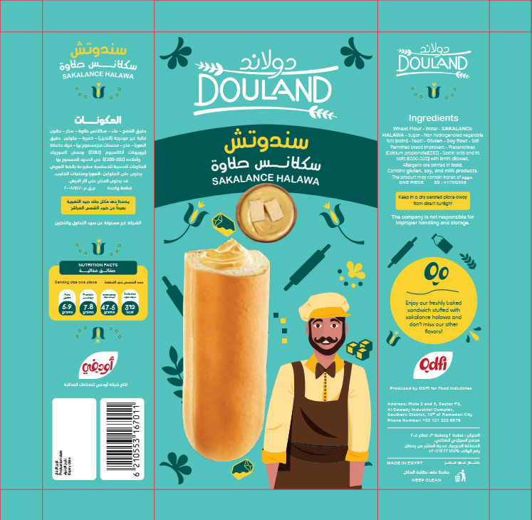 Wheat Flour – Water – SAKALANCE HALAWA – sugar – Non hydrogenated vegetable fats (palm) – Yeast – Gluten – Soy flour – Salt Permitted bread improvers – Preservatives (Calcium propionate(E282) – Sorbic acid and its salts (E200-202)) with limits allowed. Allergens are printed in bold. Contains gluten, soy, and milk products. The product may contain traces of eggs.